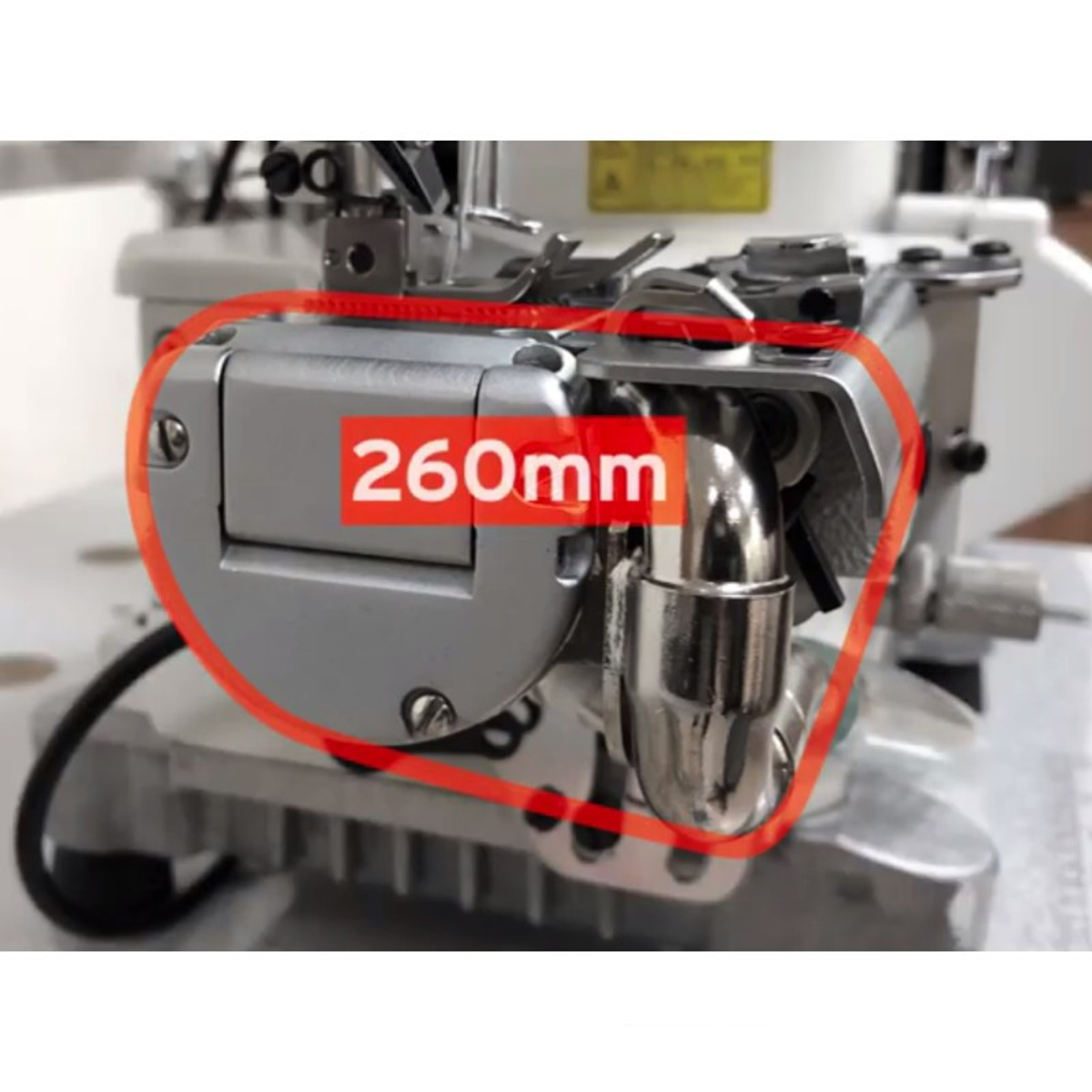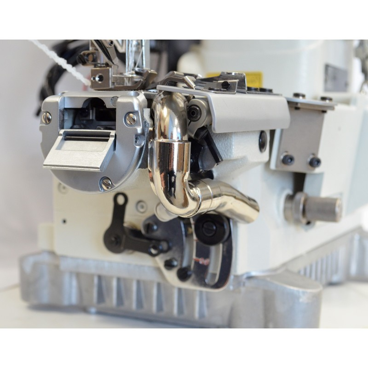 Specjalistyczna maszyna drabinkowa 3-igłowa wyposażona w wąski cylinder do podwijania dołów w odzieży sportowej (podkoszulki T-Shirt itp.) wyposażona w lewy nóż odkrawający nadmiar podwiniętego materiału oraz system odsysania odciętych skrawków. Ścieg 2 lub 3 igłowy z górnym przeplotem lub bez (możliwe jest szycie bez górnego przeplotu).