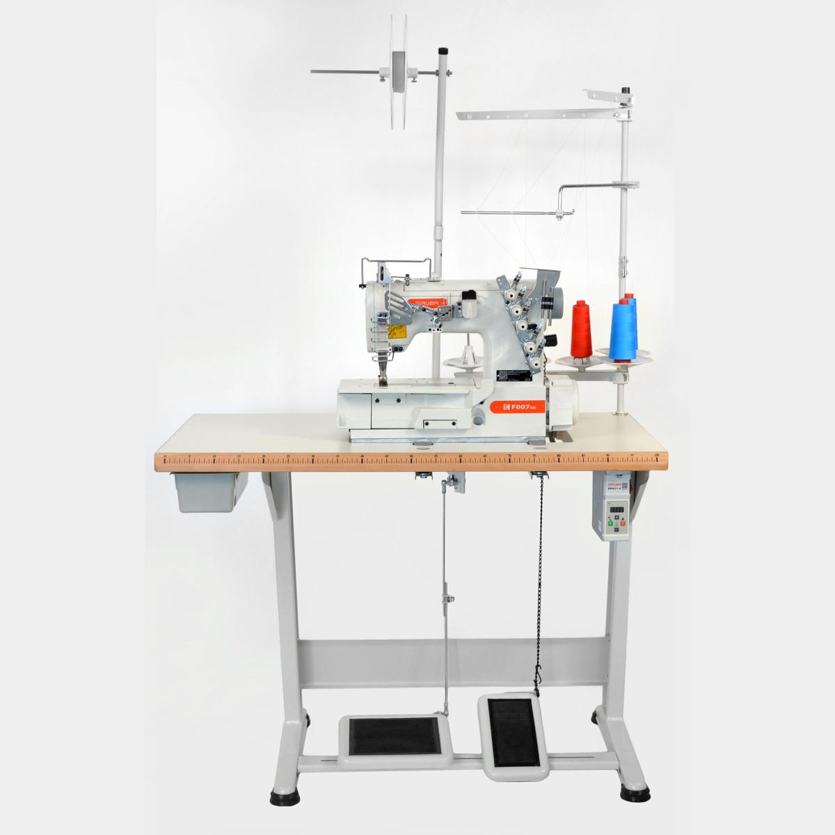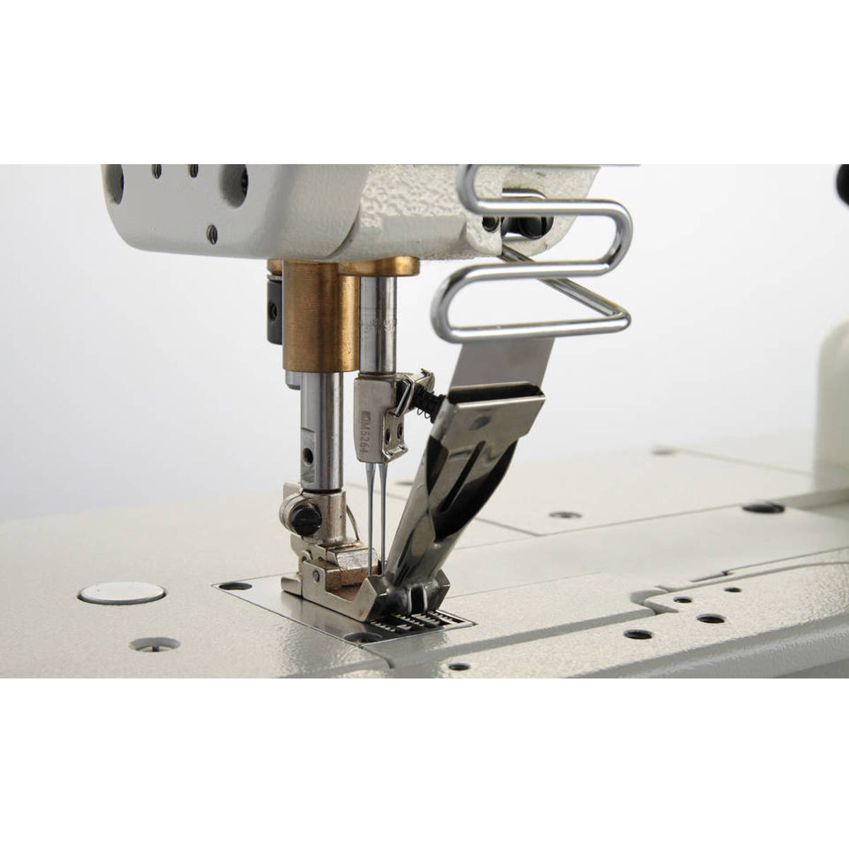 Maszyna łańcuszkowa 2-igłowa, 4-igłowa, łoże płaskie, wyposażona w dwa chwytacze (dwa ściegi łańcuszkowe). Maszyna przeznaczona do naszywania pojedynczego lampasa/napotnika o szerokości 10 mm. Silnik energooszczędny zamontowany w głowicy maszyny (DirectDrive).