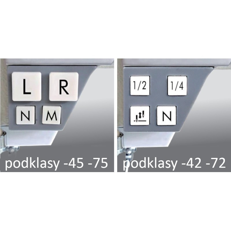 Maszyny bez dzielonej igielnicy (podklasy -42 i -72) posiadają na powyższym panelu przyciski zagęszczania 1/2 ściegu oraz 1/4 ściegu